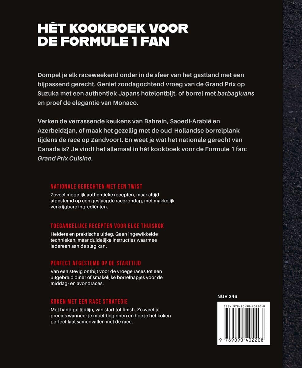 Verken de verrassende keukens van Bahrein, Saoedi-Arabië en Azerbeidzjan, of maak het gezellig met de oud-Hollandse borrelplank tijdens de race op Zandvoort. En weet je wat het nationale gerecht van Canada is? Je vindt het allemaal in hét kookboek voor de Formule 1 fan: Grand Prix Cuisine.